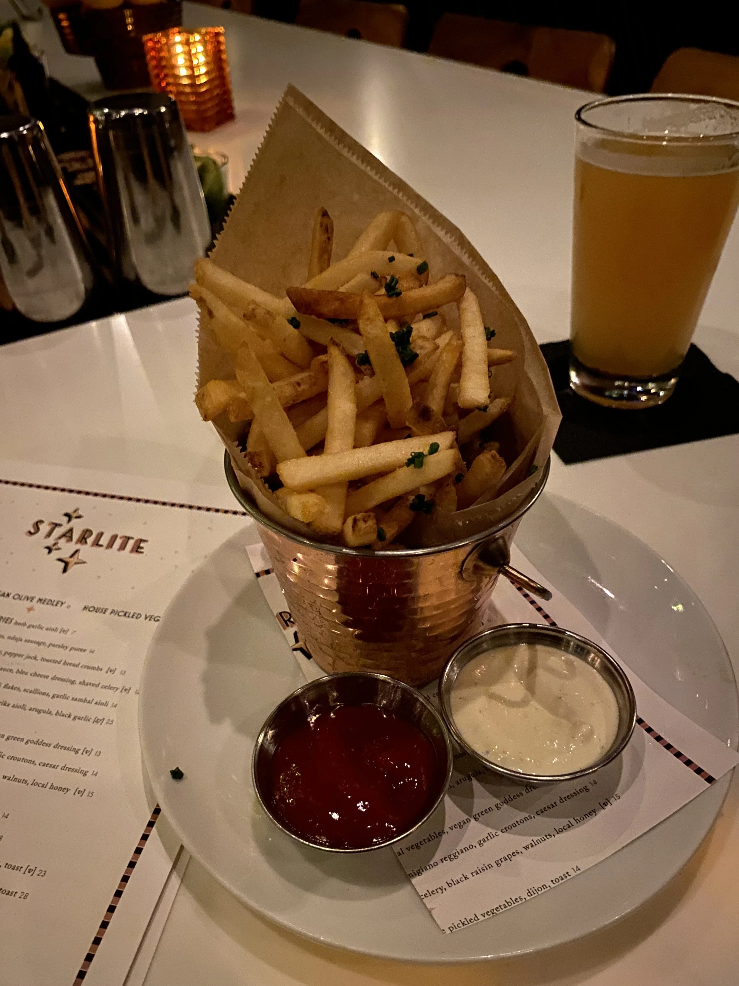 You can’t ever not like a presentation of fries in a silver cup. It just makes everything else feel so elevated. But really, Starlite is one of those beautiful San Diego places that has been on India street for a very long time. In addition to the fries being exquisite, they have the best Kentucky Colonel Mule and Moscow Mule in town!