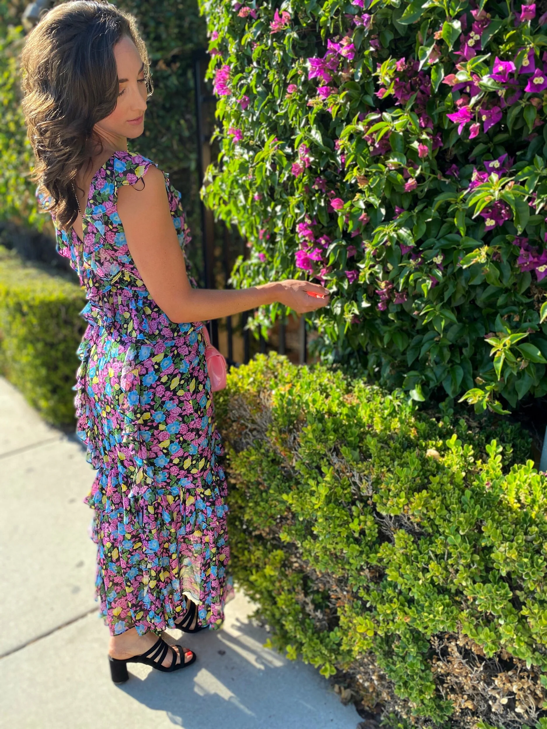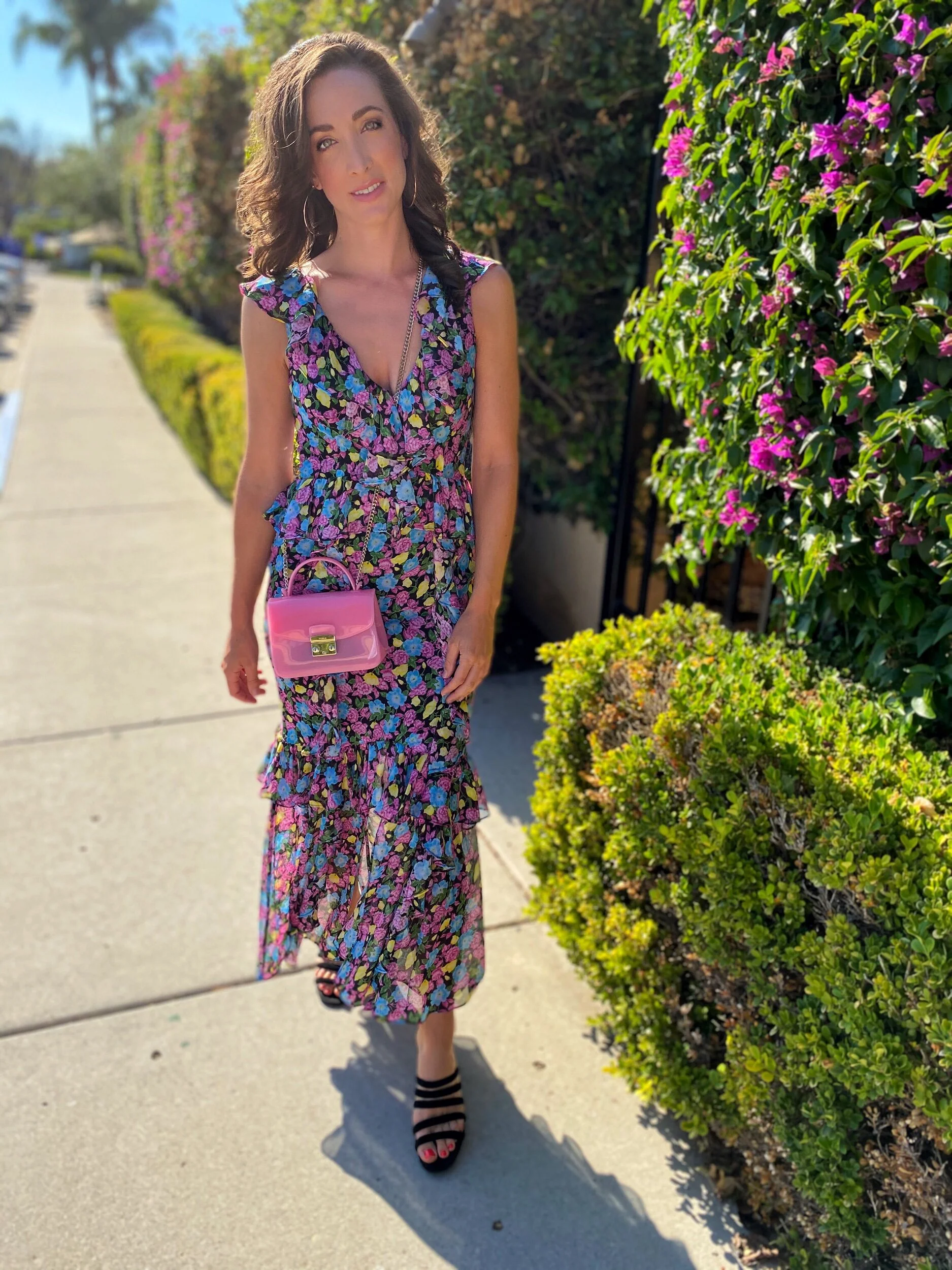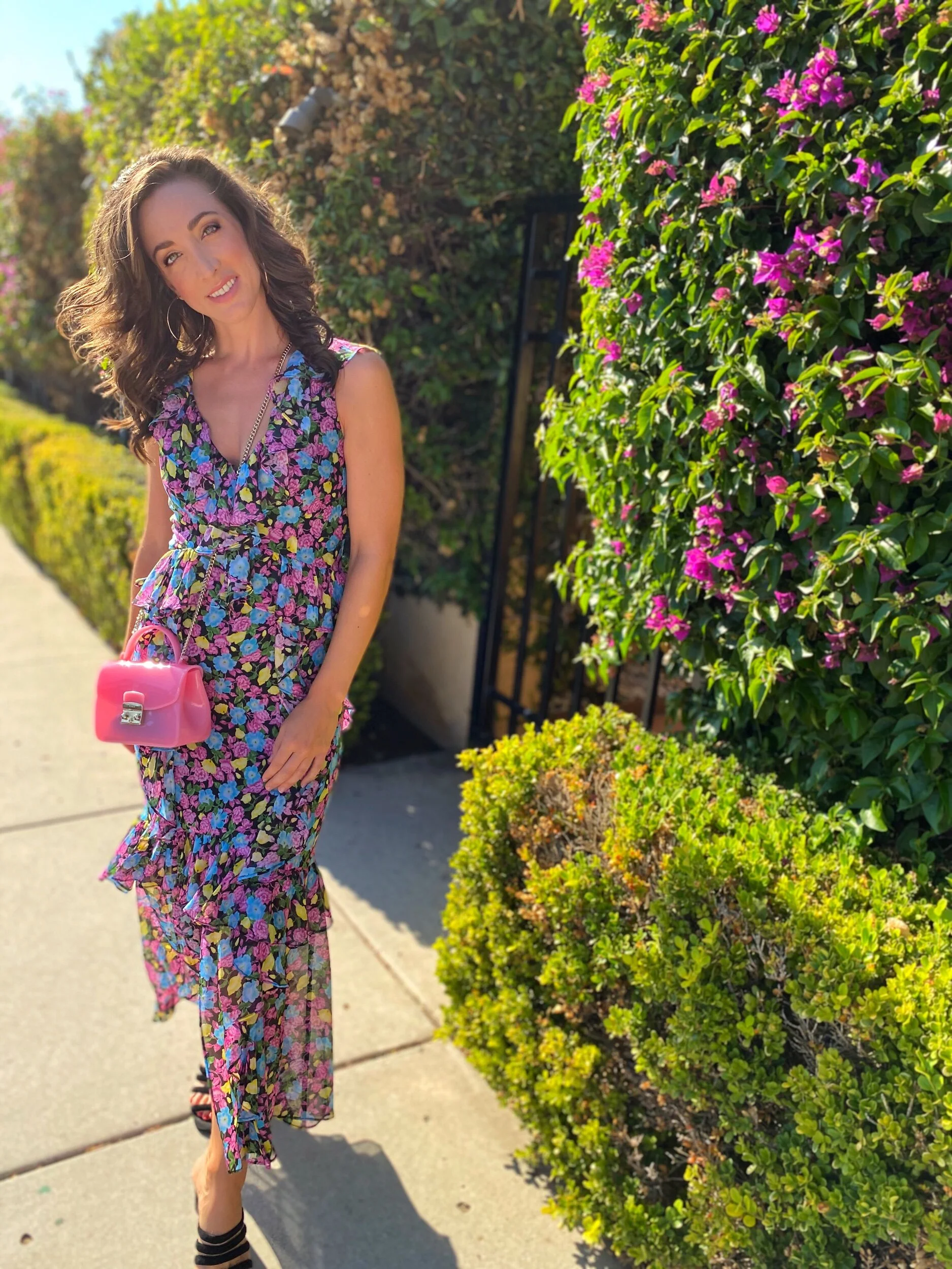 AMUR: Evita Maxi Dress - shop on Tootsies and Verishop. FURLA: Mini Candy Bag - similar here. Marc Fisher: Mule Sandals.